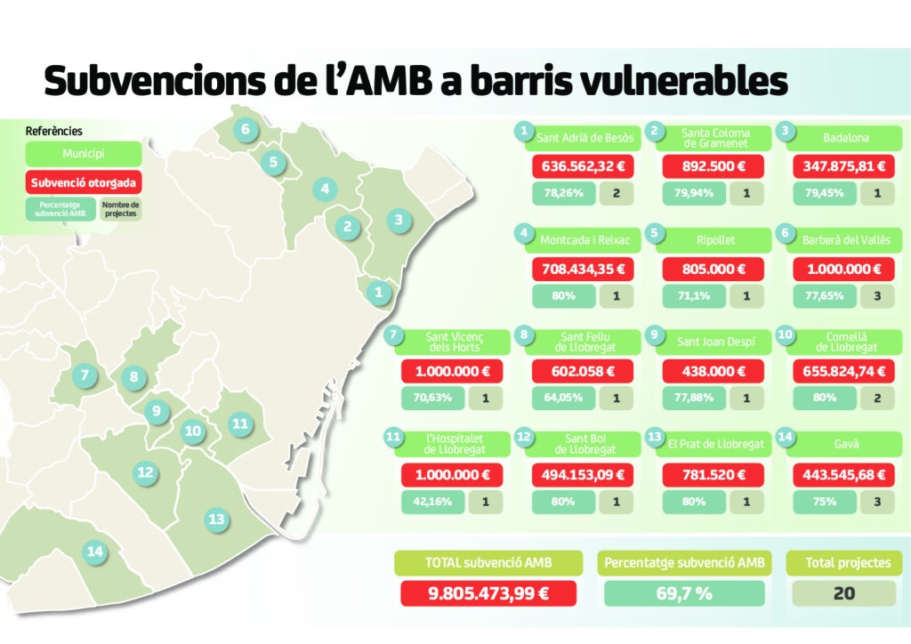 L’Àrea Metropolitana de Barcelona ha impulsat un pla de xoc de 9,8 milions d’euros per combatre la pobresa urbana dels barris amb més desigualtat i precarietat de la metròpolis de Barcelona. El pla de finançament arriba fins al 2024 i afectarà diversos barris de fins a 14 municipis de l’entorn de Barcelona. Són: Badalona, Barberà del Vallès, Cornellà de Llobregat, el Prat de Llobregat, Gavà, l’Hospitalet de Llobregat, Montcada i Reixac, Ripollet, Sant Adrià de Besòs, Sant Boi de Llobregat, Sant Feliu de Llobregat, Sant Joan Despí, Sant Vicenç dels Horts i Santa Coloma de Gramenet.