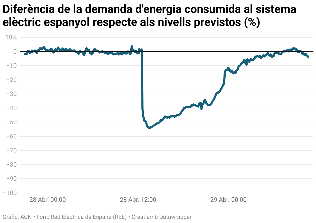 La demanda elèctrica es desploma a l’Estat espanyol. Segons dades de Red Eléctrica, a les 12.35 hores, la demanda ha passat dels prop de 27.000 megawatts (MW) als 15.970 megawatts de sobte, i ha continuat baixant fins als 14.196 MW a les 12.45 hores. A les 13.15 hores, la xifra ja era de 12.483 MW, menys de la meitat de l’energia prevista.