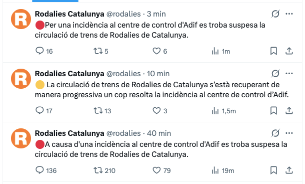 🟡 Recuperació progressiva del servei de trens de Rodalies de Catalunya un cop solucionada parcialment la incidència al centre de control de trànsit d’Adif
