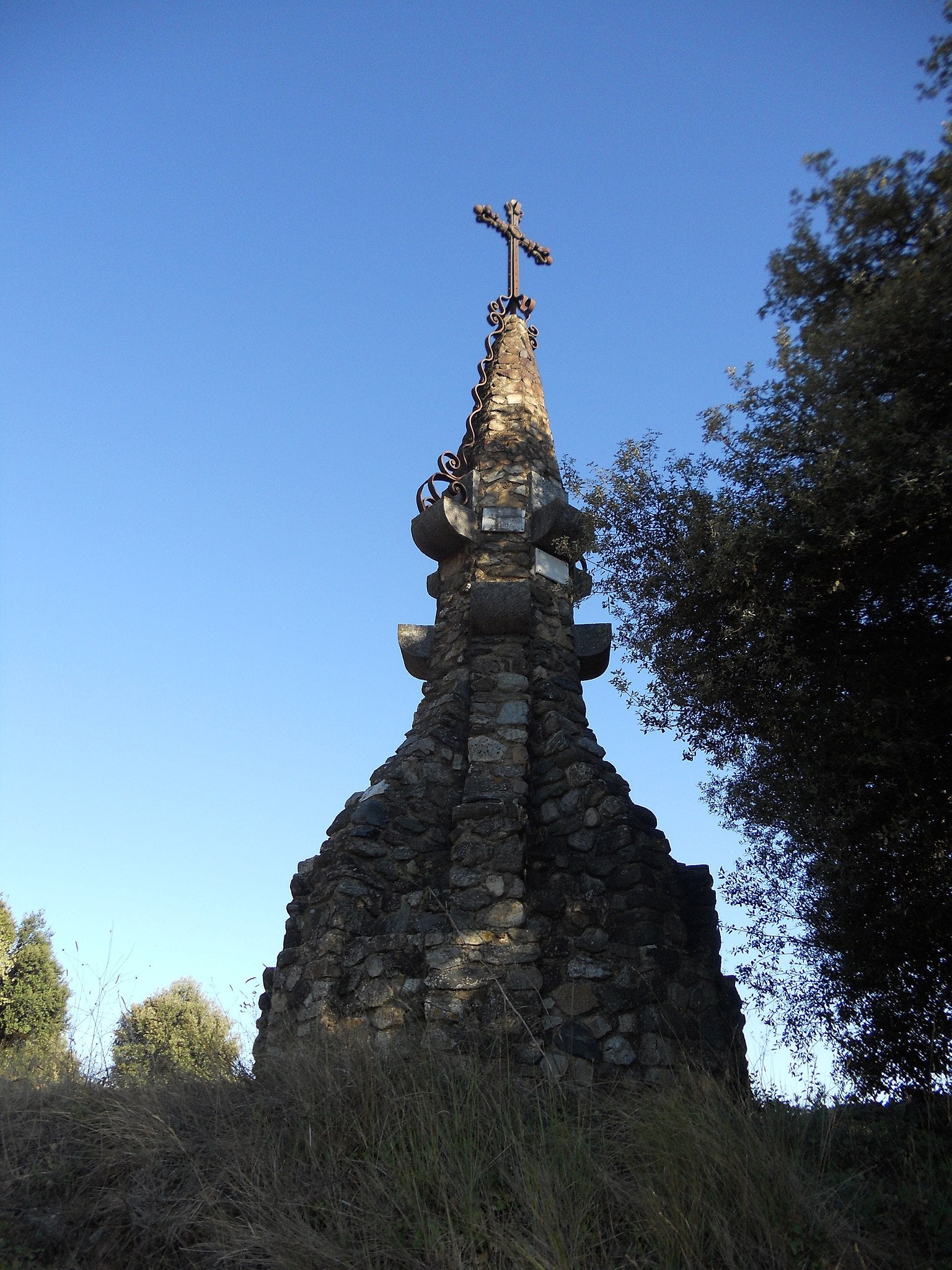 En concret, el projecte de la creu va ser un encàrrec del mossèn Celestí Castany per a Josep Fernández Casals. L’obra, però, fou executada pel celoní Josep Sivina, amb el treball de forja de Josep Planas. Es tracta d’una creu de base circular de pedra que suporta vuit contraforts que acaben amb una forma fusiforme. En el cos superior de la creu també té quatre mènsules. És a dir, quatre elements arquitectònics que sobresurten d’una estructura -generalment un mur- i que tenen una funció de sustentació d’altres elements, però també ornamental. D’aquestes mènsules també en surt el ferro forjat, de formes sinuoses, amb què corona la creu. A l’inferior de la creu hi ha una placa que commemora les diferents missions religioses que han beneït aquesta construcció modernista.