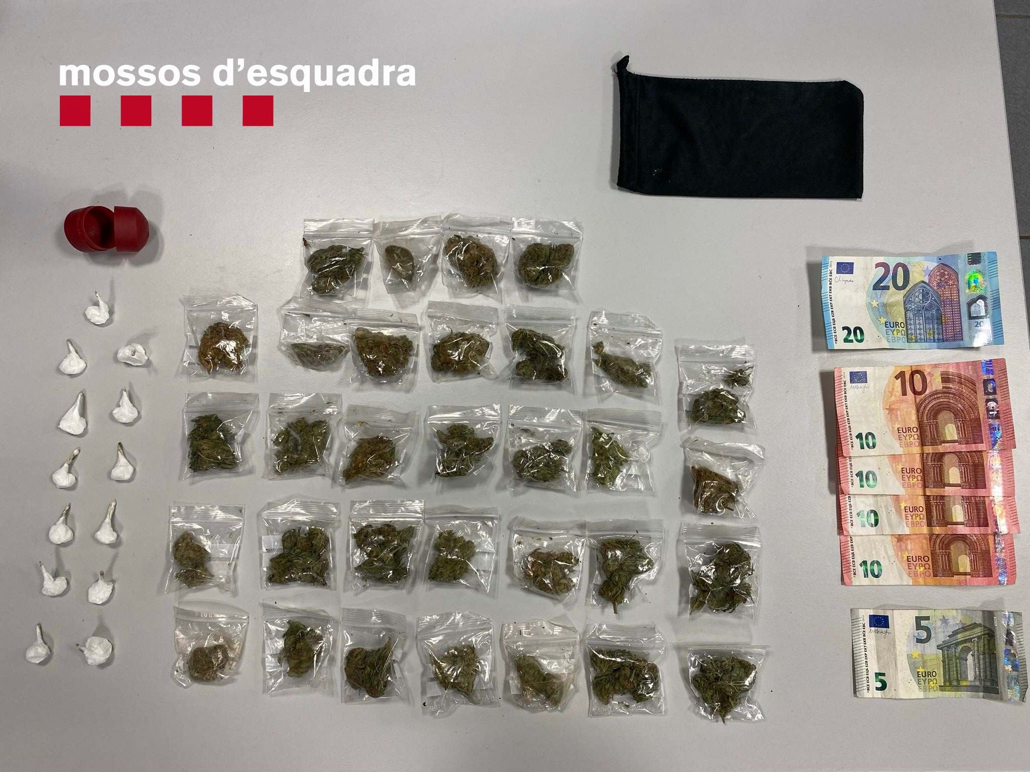 Els agents s’hi van dirigir immediatament i en recollir la bossa van constatar les seves sospites. A dins hi havia 32 bossetes de plàstic amb marihuana al seu interior i una caixa amb tretze embolcalls de cocaïna. Tot això ho portava clandestinament a les seves parts íntimes. A més, l’home portava 65 euros en bitllets fraccionats, un senyal tòpic, pels investigadors que es tractava d’efectiu provinent de la venda d’estupefaents.