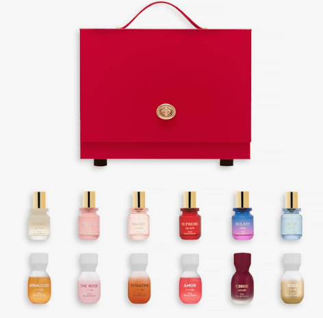 Aquesta col·lecció ve presentada en un vistós estoig vermell molt coquetó que inclou les seves 12 fragàncies femenines en format mini.